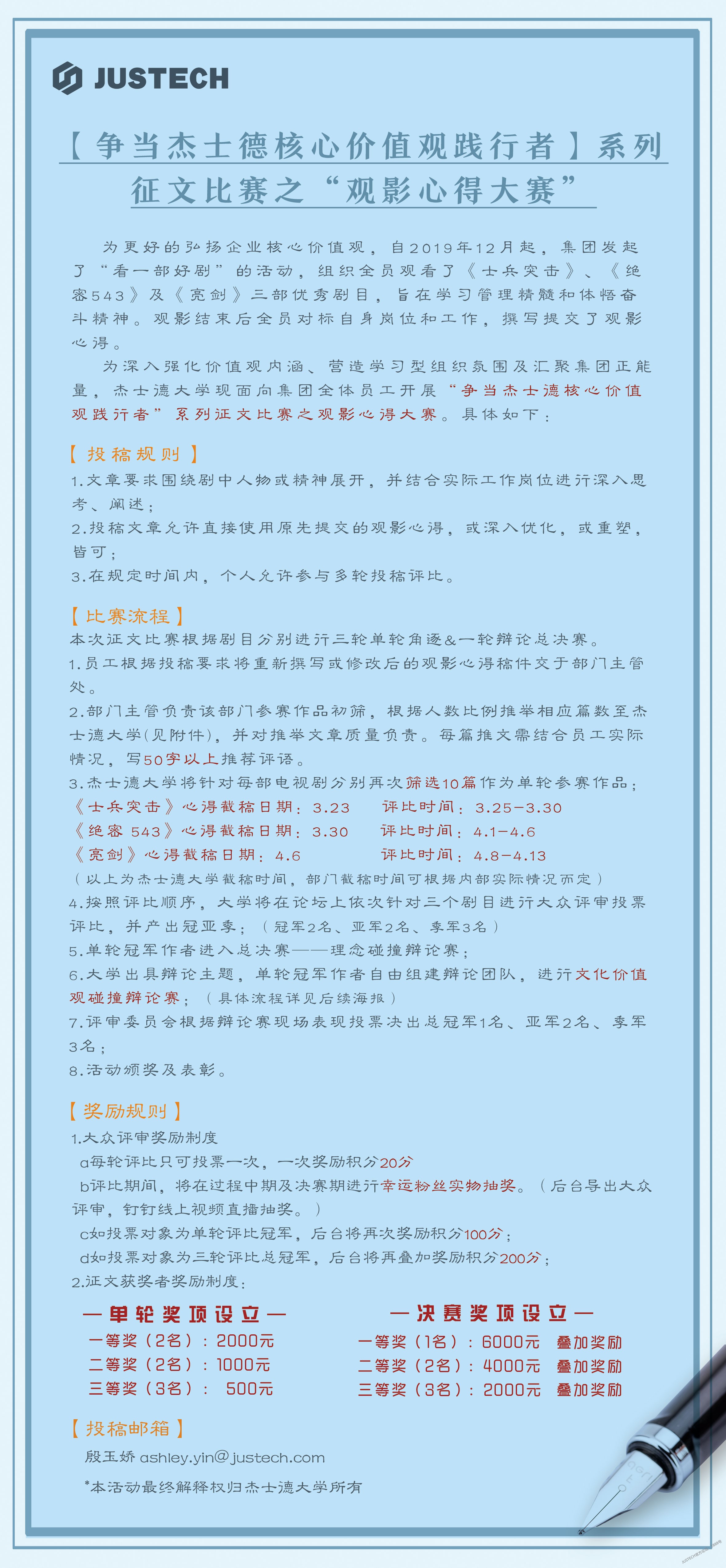 為深入強化價值觀內涵、營造學習型組織氛圍及匯聚集團正能量,現杰士德大學面向全體員工開展了“爭當杰士德核心價值觀踐行者”系列之觀影心得征文比賽。