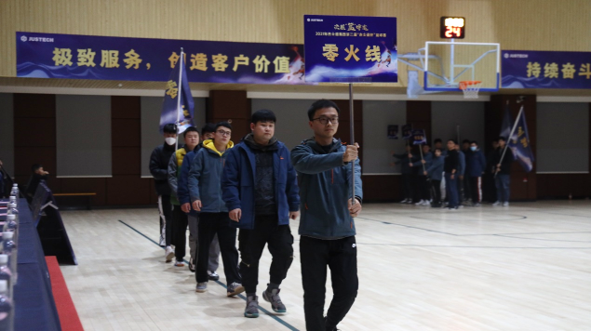 閉幕儀式上,伴隨著歡快的《運動員進行曲》,在四名意氣風發的旗手的護衛下,集團司旗莊重入場,隨后,各參賽隊邁著鏗鏘整齊的步伐,以昂揚的姿態步入場館。