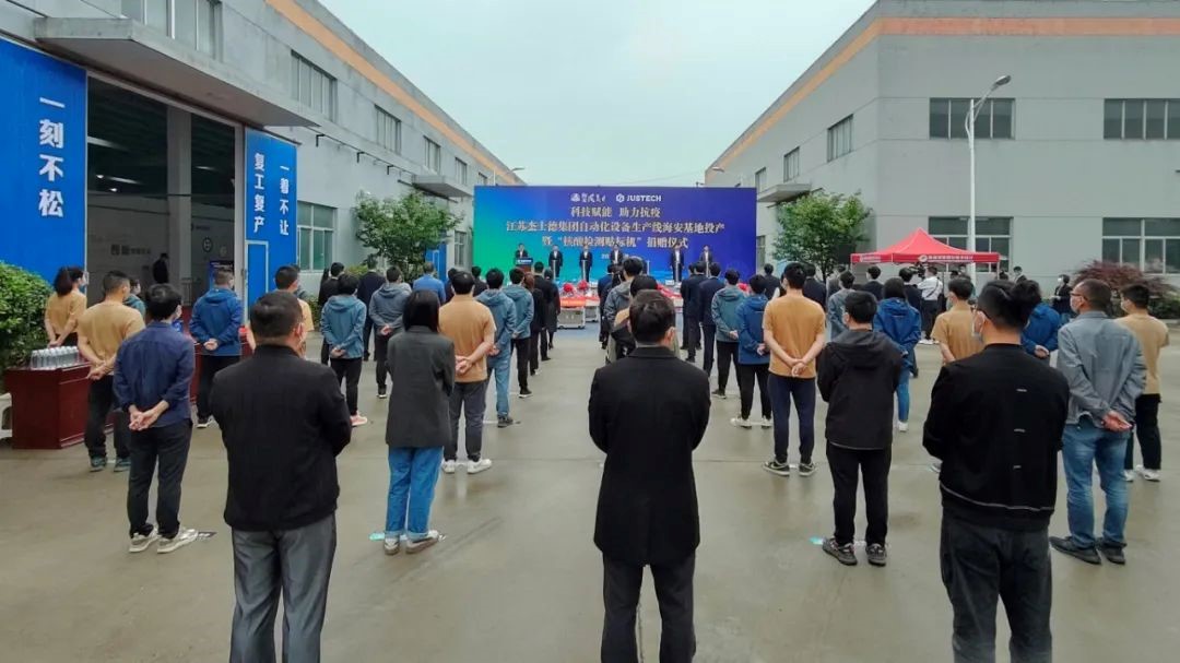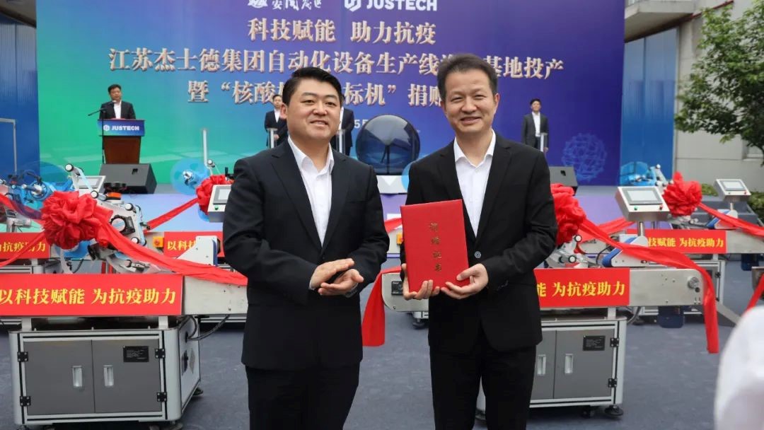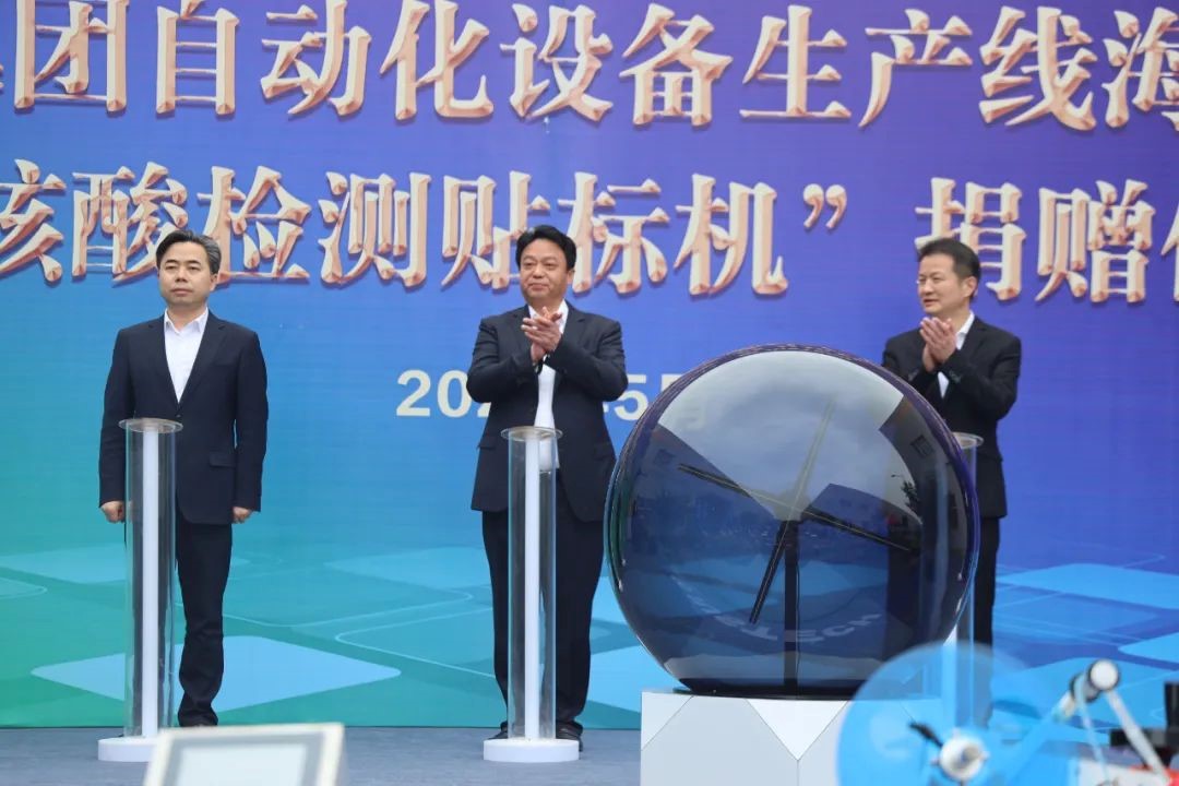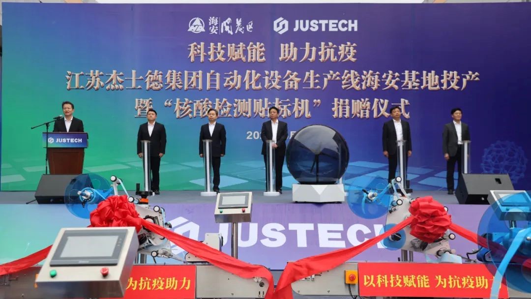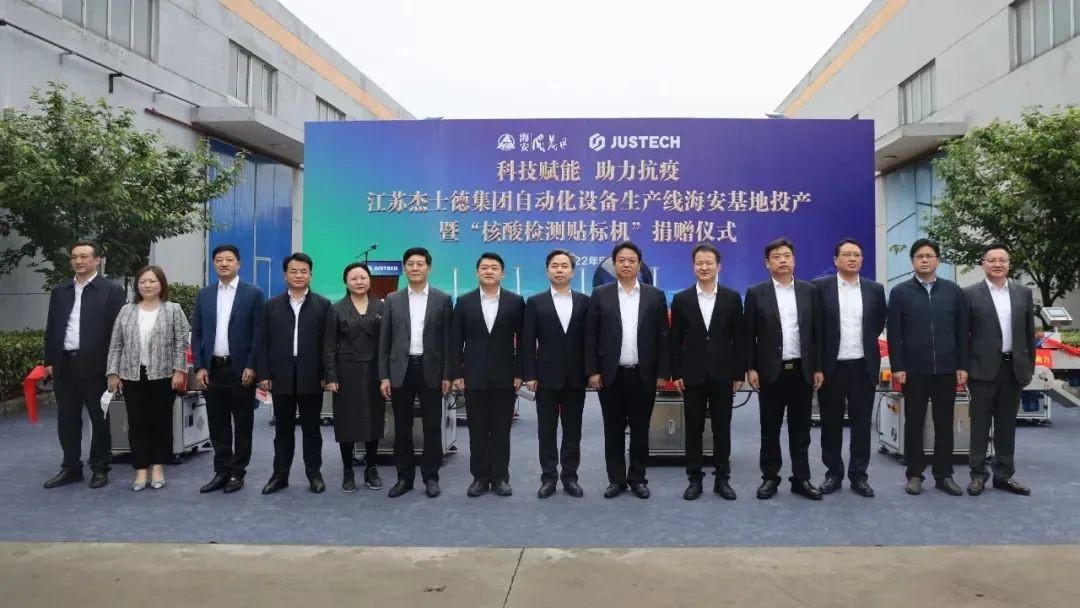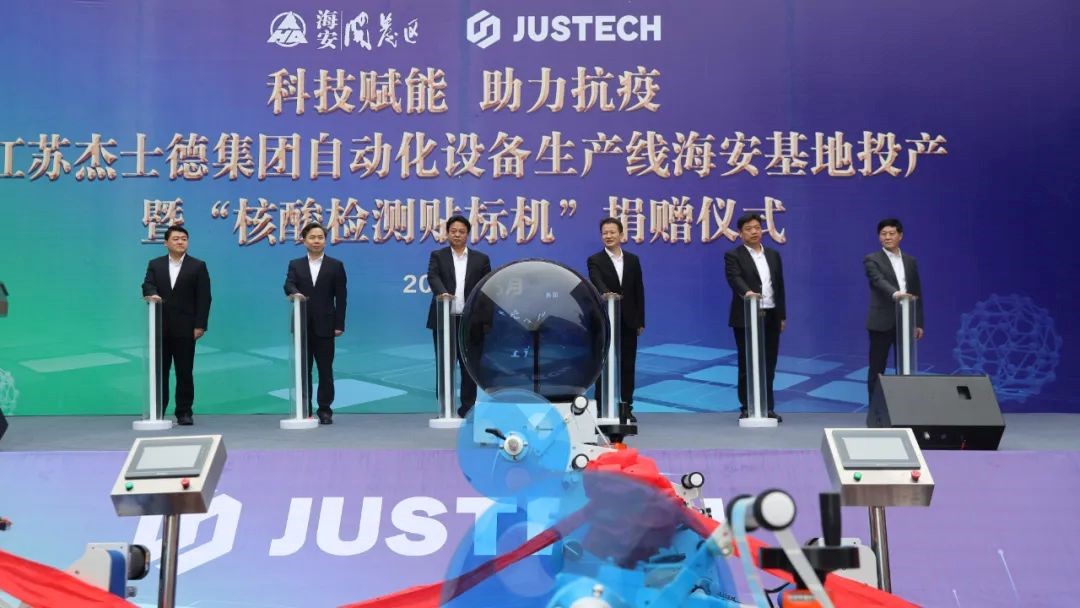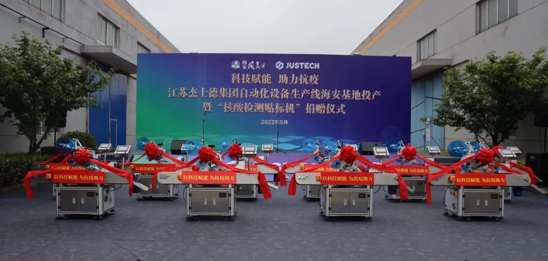 2022年5月13日上午8時30分,杰士德集團自動化設(shè)備生產(chǎn)線海安基地投產(chǎn)暨“核酸檢測貼標(biāo)機”捐贈儀式在海安隆重舉行。