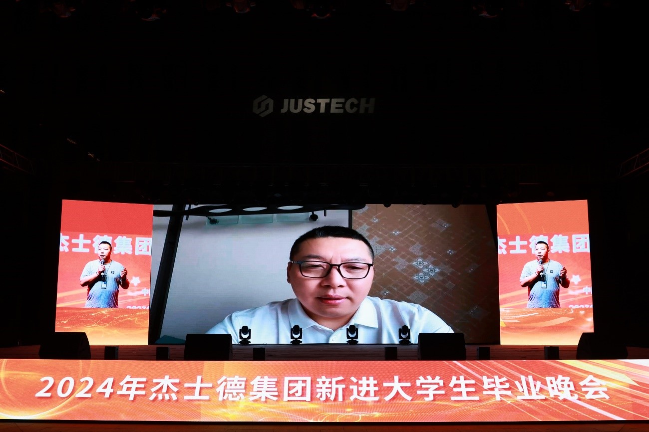 千里之外,真情尤濃!在畢業晚會伊始,因海外出差行程未能出席晚會的集團創始人、董事長、杰士德大學校長景余祥先生率先通過視頻連線方式為第九屆卓越班大學生們順利結業送上祝福與期待。