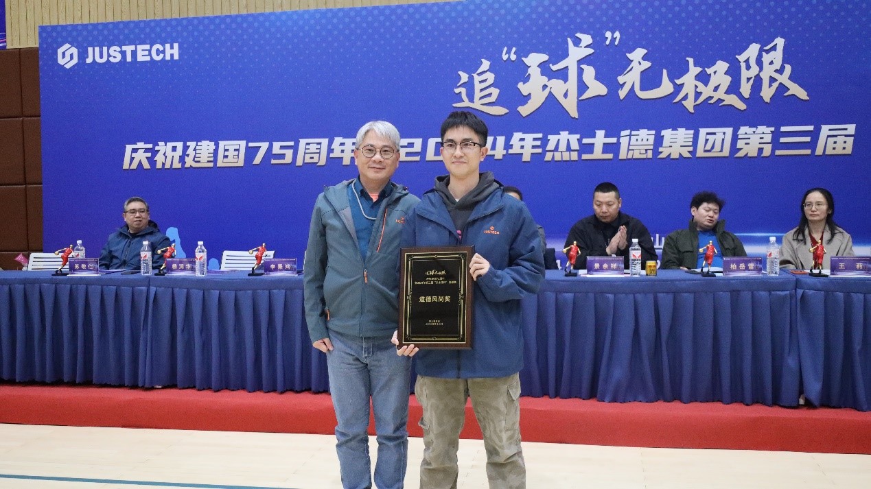 杰士德集團CRO、艾派科技總經(jīng)理黃芳,杰士德自動化副總經(jīng)理黃玉銘為獲得本次籃球賽的季軍隊伍—螺絲釘隊頒獎。