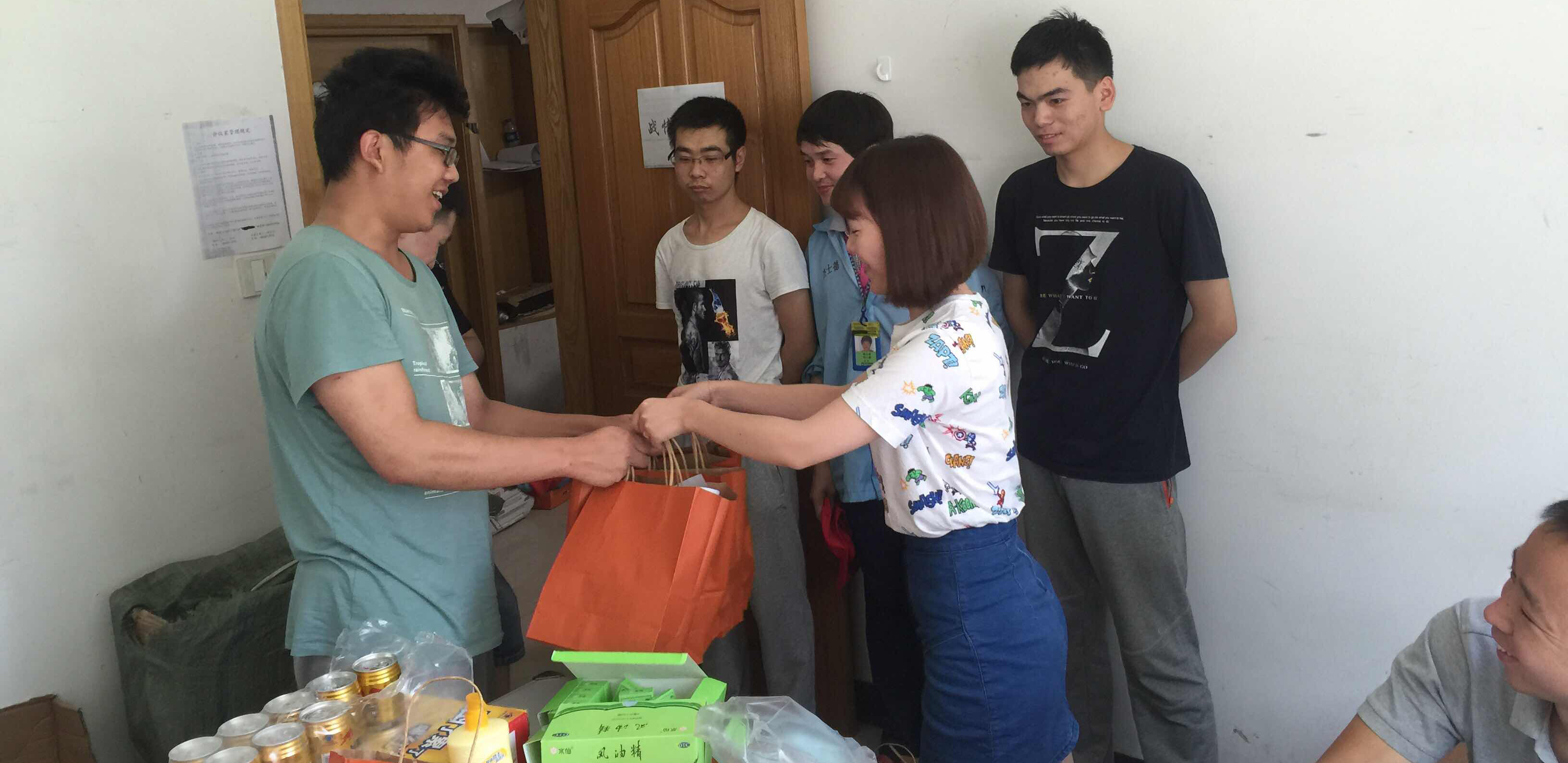各項目地的小伙伴們就像辛勤的小蜜蜂,不分晝夜地揮動著青春與激情的翅膀,用智慧和汗水去渡過一重重難關,完成客戶交付的一項項任務,為我杰士德大家庭采花釀蜜。為了向我們的“一線戰士們”道一聲辛苦,家里組織了以小編和Eason為首的慰問團,帶著家里對在外拼搏的小伙伴們的感謝和問候,為各項目地小伙伴們送去家里精心準備的“清涼四件套”。
