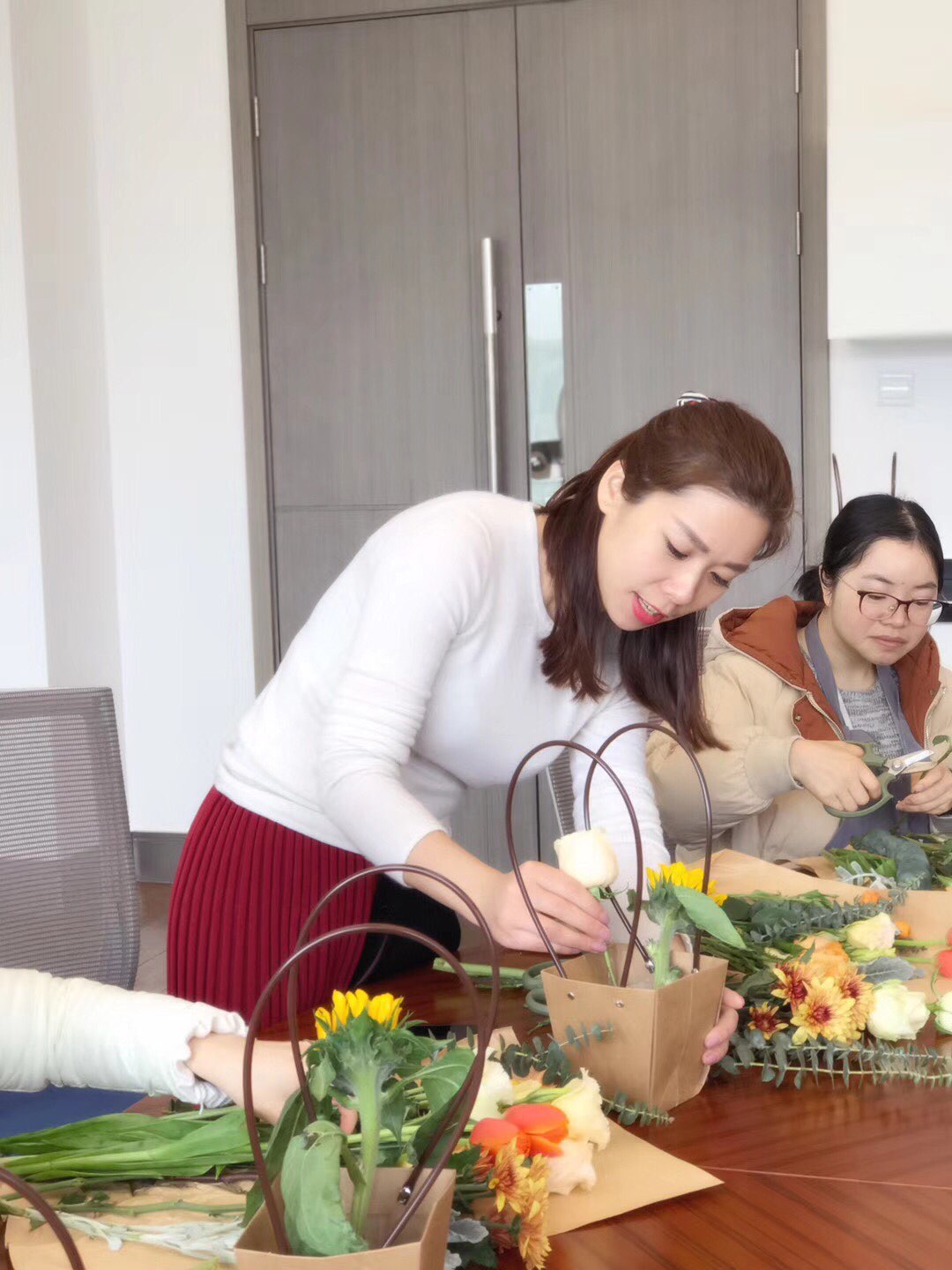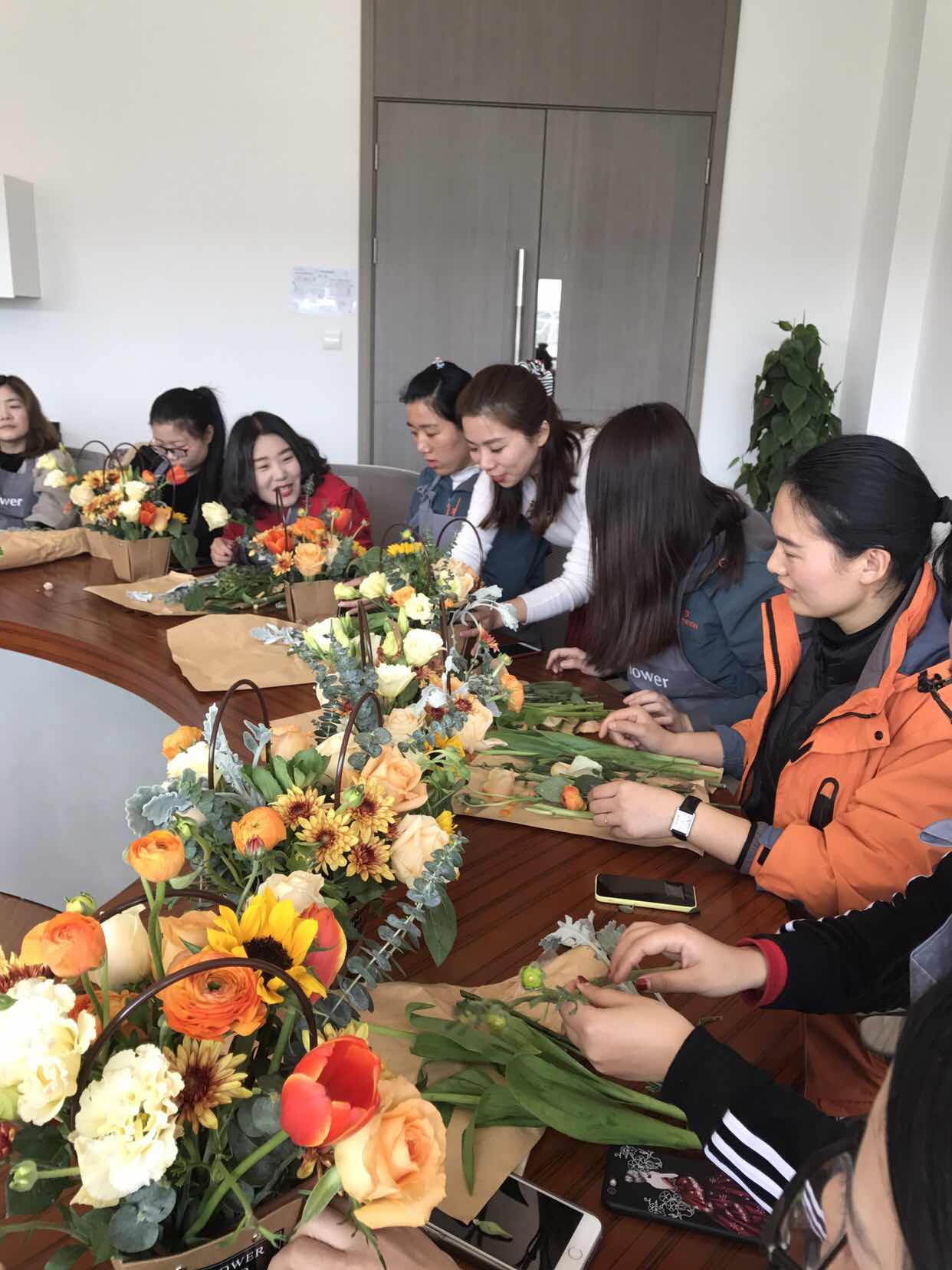 在老師的傾心指導下,童鞋們興致勃勃地開始了插花實踐。修剪花枝、整理花朵、討論插花位置和技藝,還不時觀摩其他員工的作品,或向老師求教,興致盎然。一時間,鮮花麗人,交相輝映,美不勝收!