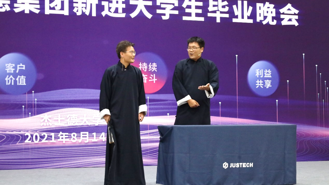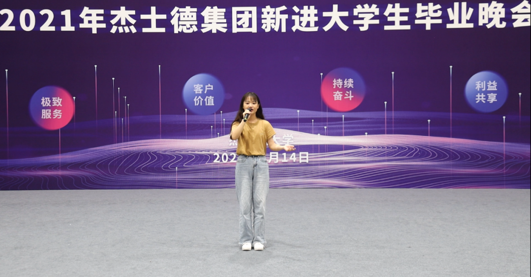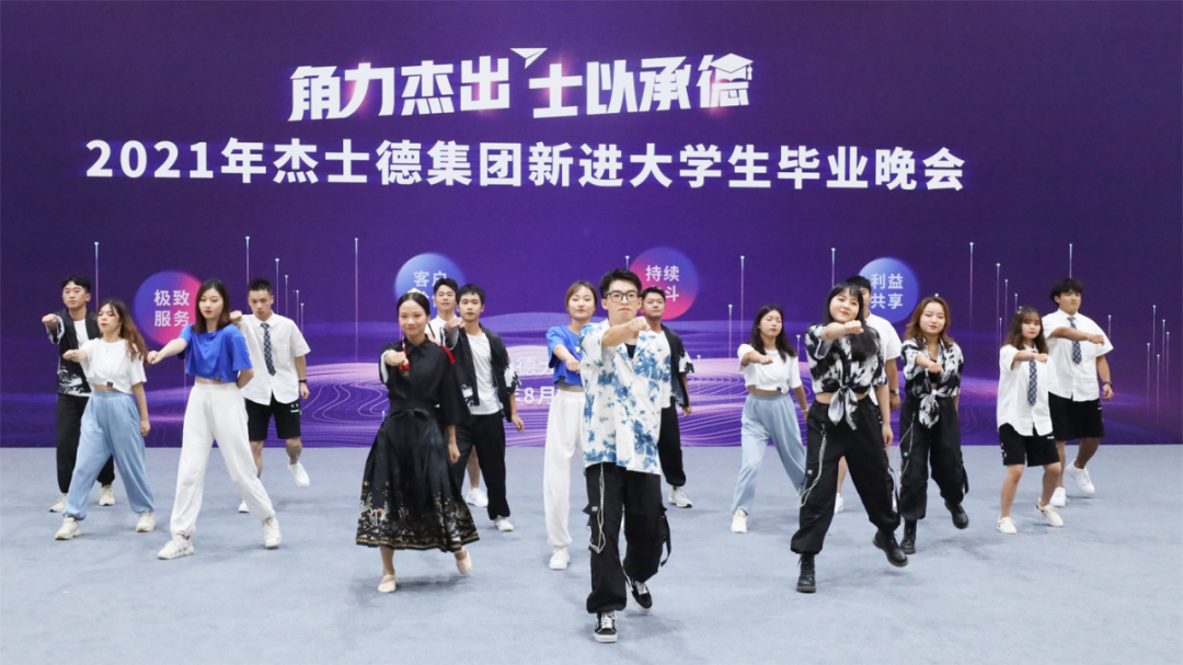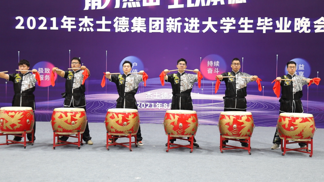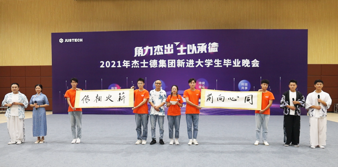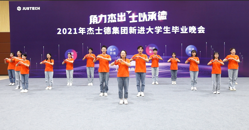 征程是面對未來的勇氣,匯演以氣勢恢宏、鼓聲震天、正氣浩然的鼓舞節目《燃》拉開帷幕;一首蕩氣回腸、婉轉悠長的《萬疆》搭配葛小勇老師蒼勁有力的書法表演,將杰士德人同心向前,薪火相傳的精神表現得淋漓盡致;鏗鏘有力的軍體拳全方位展示了新進大學生們在烈日下所取得的進步與蛻變;相聲表演《愛在杰士德》以幽默、風趣的形式展現了他們這一個月里的用心觀察,細心體會,體現了大學生們對杰士德文化的高度認同;激蕩人心的歌曲串燒將現場氛圍推向高潮,展現了杰士德集團蓬勃的朝氣和高昂的拼搏勁頭;以平行時空,新老員工隔空對話形式的朗誦,展現了杰士德文化的傳承與幫帶;情景劇《城北西路的日子》以劇中劇的方式,講述不同性格、不同背景的年輕人,在杰士德相互包容、快速成長、滿懷熱血、擁抱未來的故事;舞蹈串燒充分展現了杰士德新員工的青春活力、多才多藝;第五屆卓越班袁凡學姐現場演唱了原創歌曲《JUSTECH》,在動感而動聽的旋律中,感受到杰士德的文化正以全新的形式傳播、流淌;大學生們以動作整齊、飽含深情的手語舞《聽我說謝謝你》表達了對培訓期間所有的老師的感恩之情;整場匯演在全體演職人員共同唱響的杰士德集團司歌——《在你身旁》中落下帷幕。