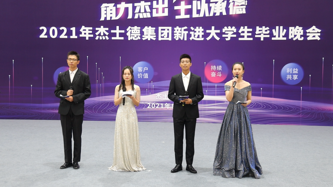 星光不問趕路人,時光不負有心人。8月14日下午13:30 ,2021年杰士德集團第六屆卓越班新進大學生匯報演出于園區室內籃球場舉行。杰士德集團創始人、董事長、杰士德大學校長景余祥,董事長特助、江蘇杰士德精密工業有限公司副總經理、杰士德大學常務副校長魏小俊,董事長特助、集團人力資源中心副總經理楊易喬作為嘉賓代表受邀出席。