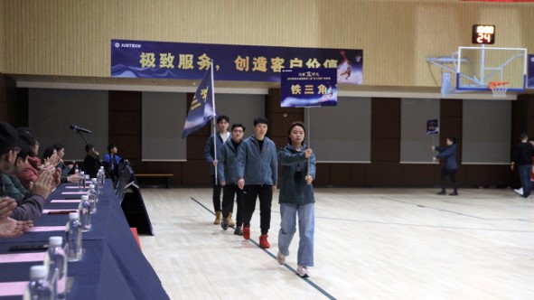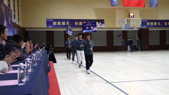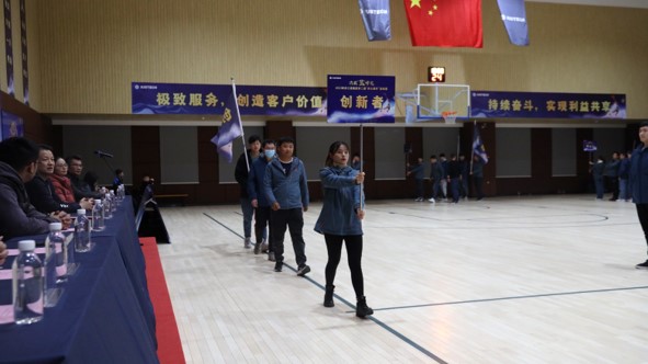 閉幕儀式上,伴隨著歡快的《運動員進行曲》,在四名意氣風發的旗手的護衛下,集團司旗莊重入場,隨后,各參賽隊邁著鏗鏘整齊的步伐,以昂揚的姿態步入場館。