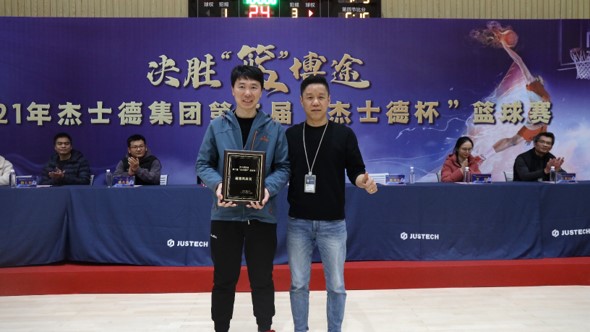 杰士德集團董事長特助、杰士德自動化項目管理中心副總經理、人力資源中心副總經理楊易喬為獲得本次籃球賽季軍隊伍——螺絲釘隊頒獎。