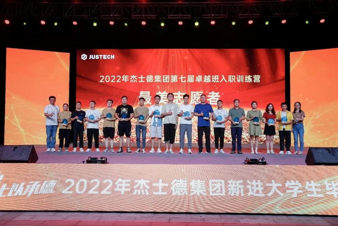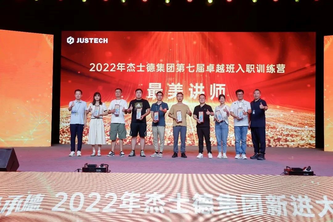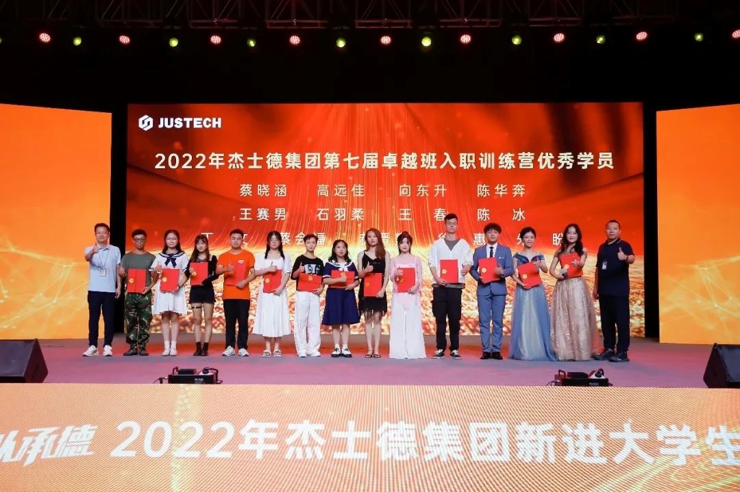 整場匯演在全體演職人員共同唱響的杰士德集團司歌——《在你身旁》中落下帷幕,這也標志著為期一個月的2022年杰士德集團第七屆卓越班入職訓練營順利落幕。作為“人才強企”戰略中極為重要的一環,在集團大力投入、高管傾心關注之下,第七屆卓越班入職訓練營在專業精心的設計與有力有序的執行中,順利推進。通過一個月的深入培訓,新進大學生們對集團的發展藍圖、企業文化、行業前景、產品知識、工作方法等方面有了全新的認知,在工作心態、個人發展規劃、團隊成長上獲得了長足的進步,并在《以忠誠之心走好人生第一步》《走進職場,學會成長》《全球化下的國際經濟發展現狀與企業國際化戰略選擇》等課程的加持下,拓寬視野,提升格局。在培訓過程中,杰士德大學還通過開展各類文化活動、拓展項目、技能競賽等,幫助新同事快速融入團隊,深入了解自己,讓彼此成為互相信賴的伙伴,并在不知不覺中與集團緊密聯系,成為榮辱與共的命運共同體。在培訓考核中,共有13名學員脫穎而出,被評為第七屆卓越班優秀學員,景董事長、魏校長為他們頒發了榮譽證書。為了肯定他們在培訓過程中展現努力奮進以及強烈的目標感,同時期待他們在以后的工作中,繼續堅定目標,保持昂揚的工作斗志,與所有的新進大學生們一起奮力拼搏、實現價值,景董事長現場宣布為他們加薪并提前轉正,即日生效。