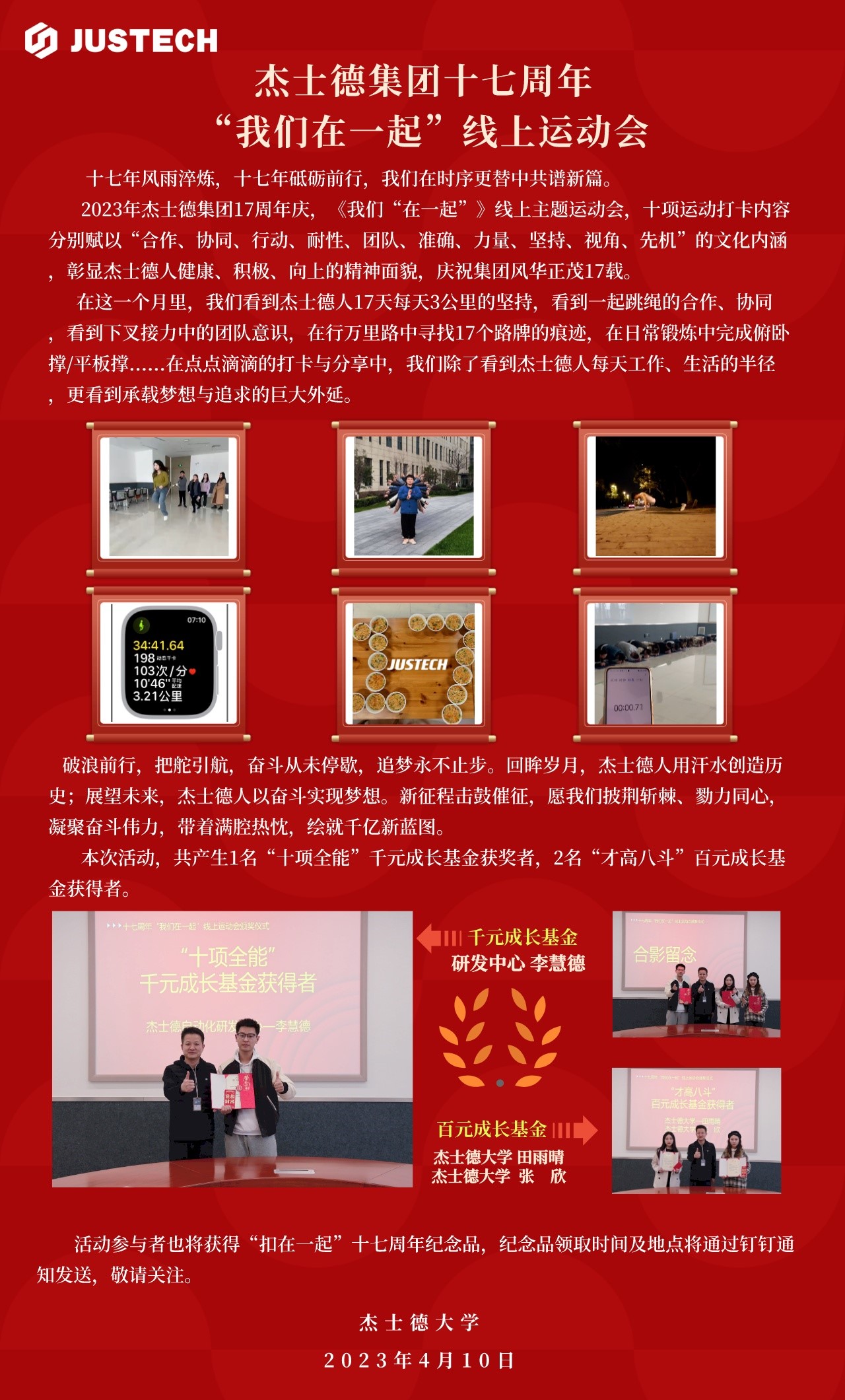 已經過去的17周年“我們在一起”線上運動會,將十項運動打卡內容分別賦以“合作、協同、行動、耐性、團隊、準確、力量、堅持、視角、先機”的文化內涵,彰顯杰士德人健康、積極、向上的精神面貌,慶祝集團風華正茂17載。