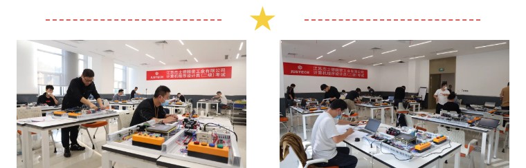 在考試前,杰士德大學同事們做了詳盡的安排,準備了1個理論考場&技能試題1(畫圖)考場、1個技能 試題2-試題3(接線&編程調試)考場、2個論文答辯考場(答辯A組&答辯B組),共4個考場。每個考場均配備了3名考評員,考評員隊伍由杰士德大學8位成員&峰之建軟件研發中心6位專家組成,專業能力和專業素質過硬,在考試中展現出了考評員的風范和能力。